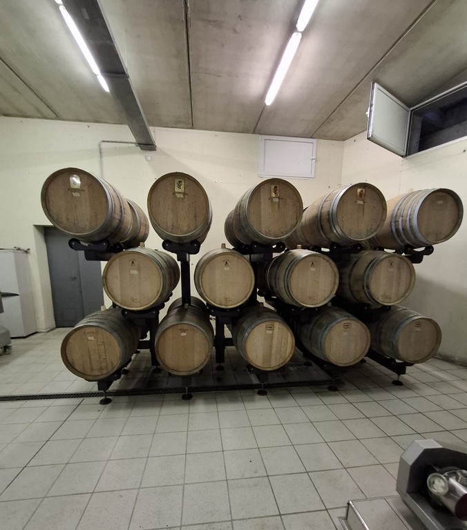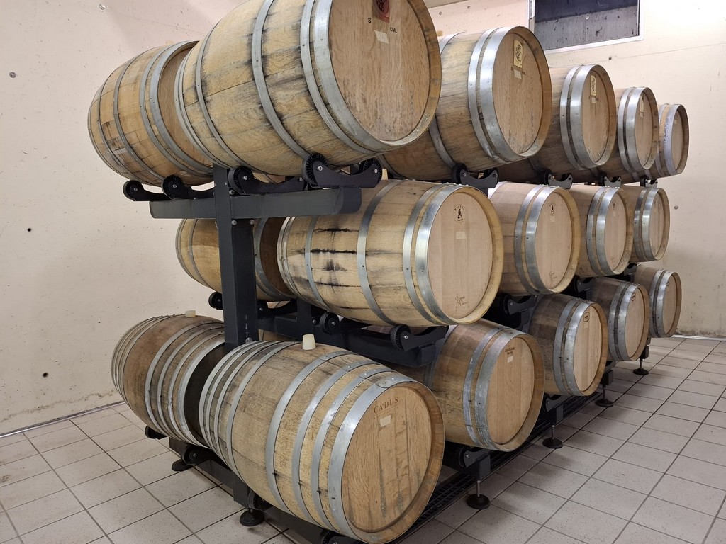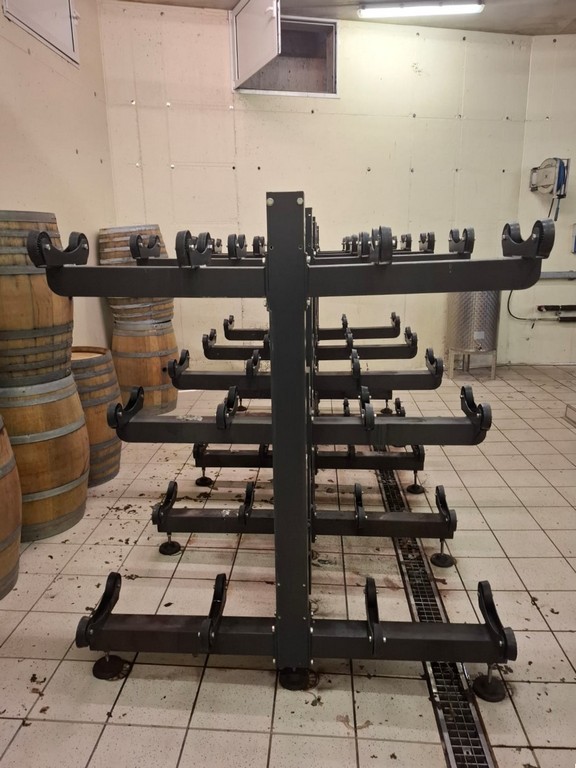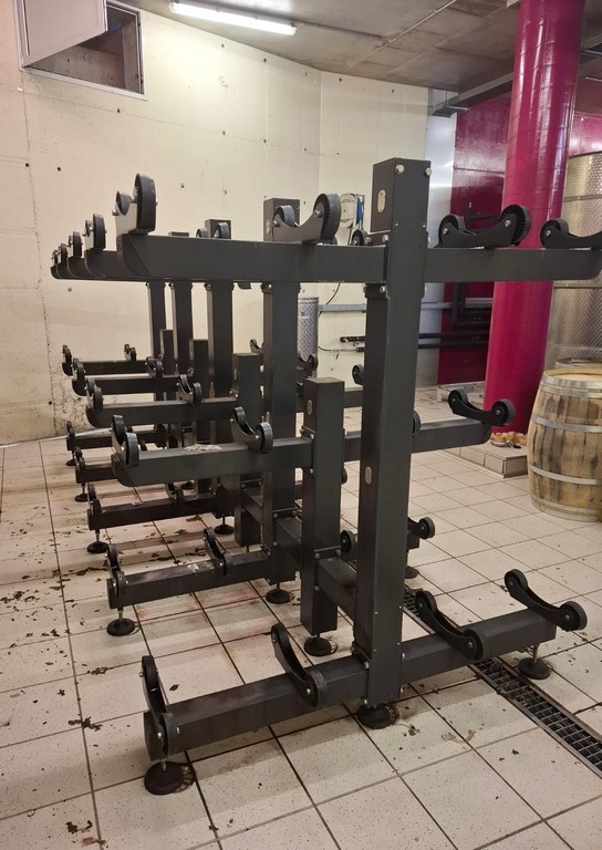 28-slot painted iron barrel support with a barrel rotation system, suitable for batonage.