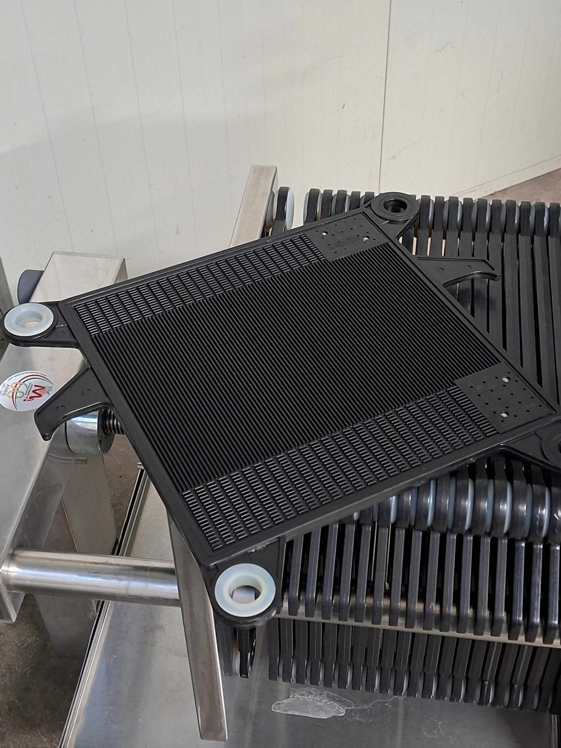 Plates Filter firm Sfoggia model 40×40, stainless steel frame, with 24 black plates in plastic material with silicone gaskets, suitable for 25 filter layers.