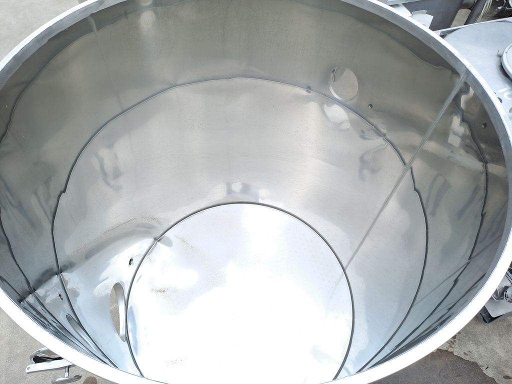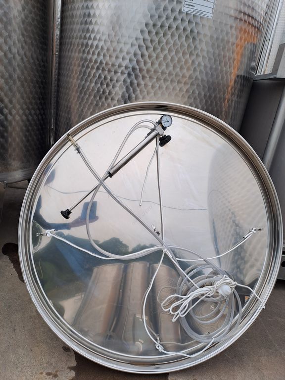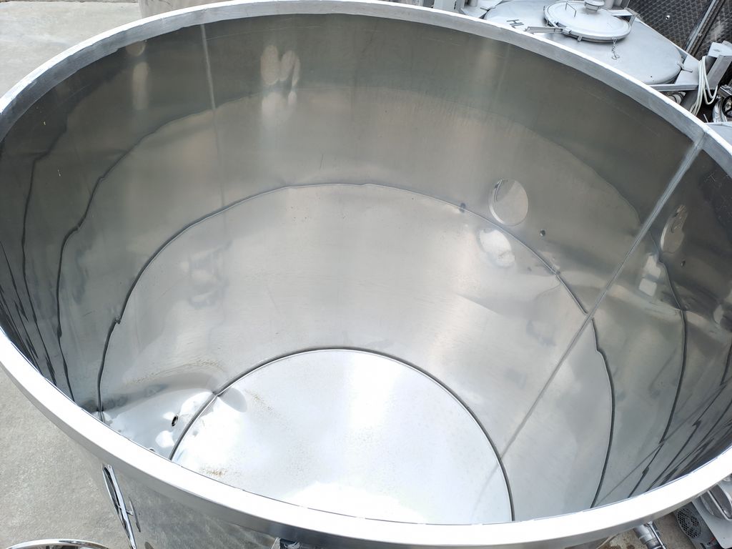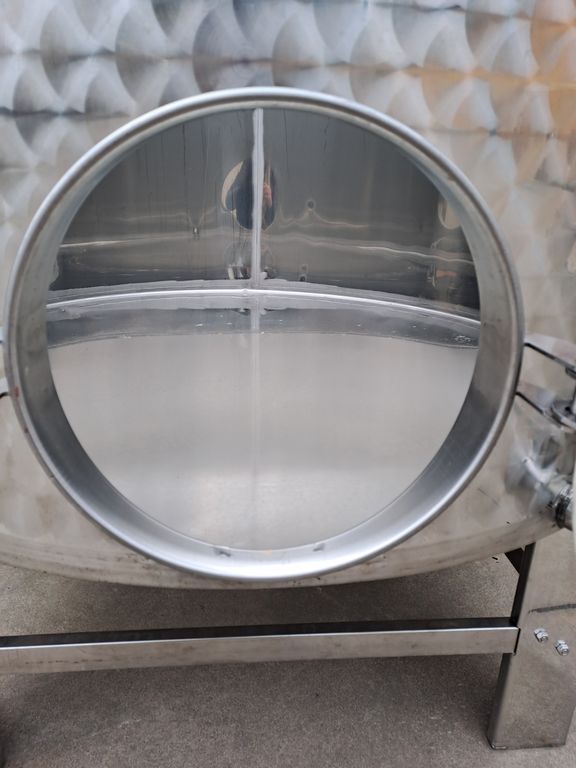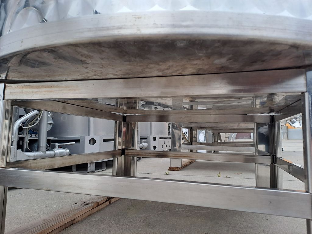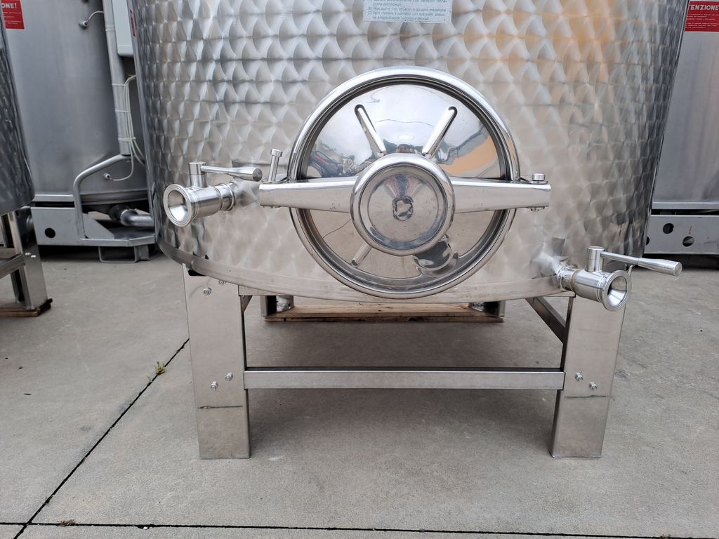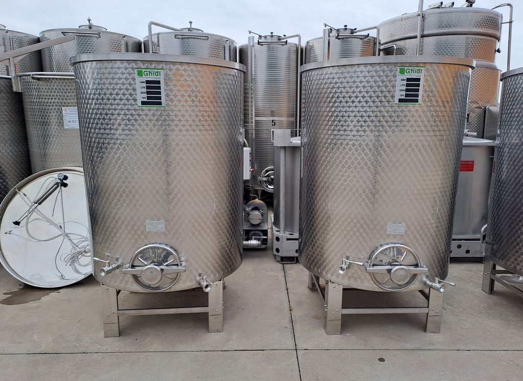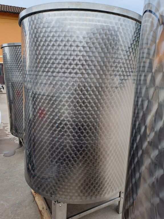 Stainless steel tanks, Ghidi brand, capacity approx. 1.500 liters (15 HL), floating lid model with flat bottom, mounted on stainless steel support stands.