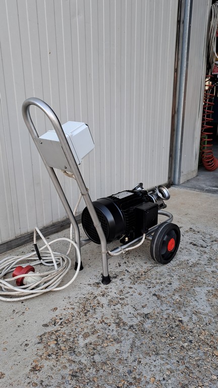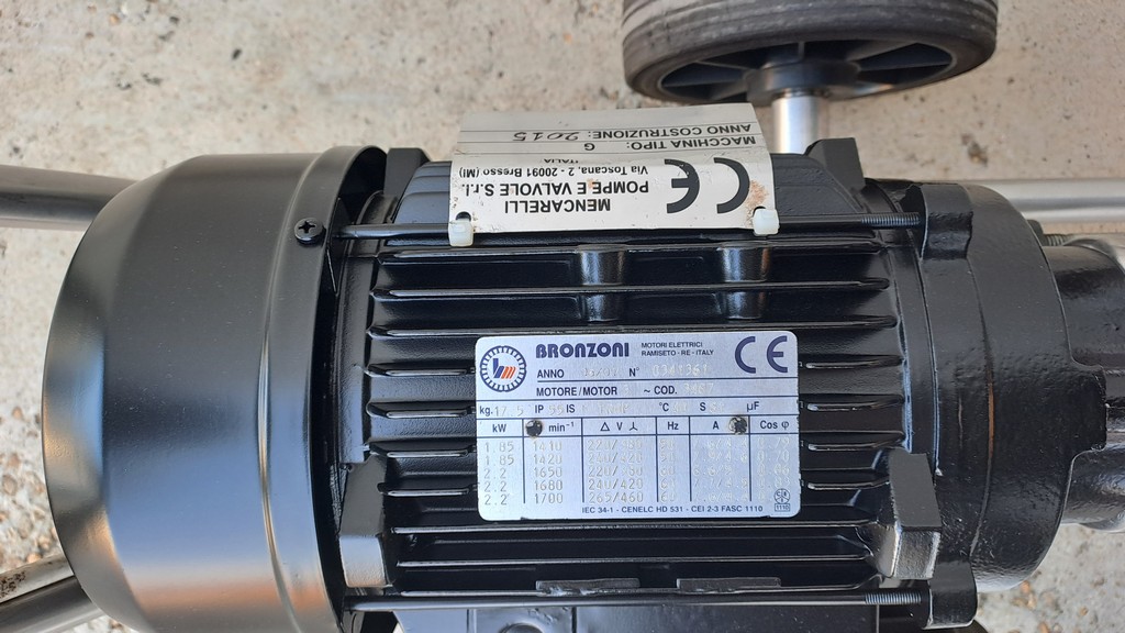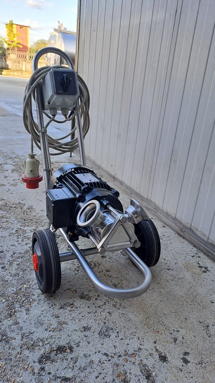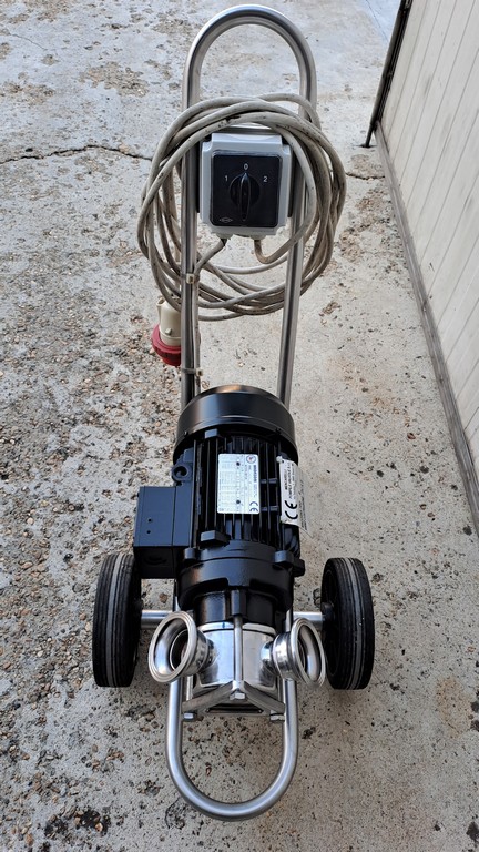 Pompa Mencarelli modello G90 con girante a palette in neoprene, corpo pompa in acciaio inox con attacchi Ø50 Garolla, completa di carrello in acciaio inox, interruttore invertitore di marcia posizionato su carrello, cavo elettrico e presa di corrente spina 16A.