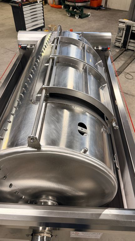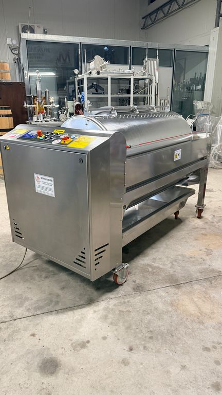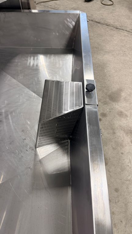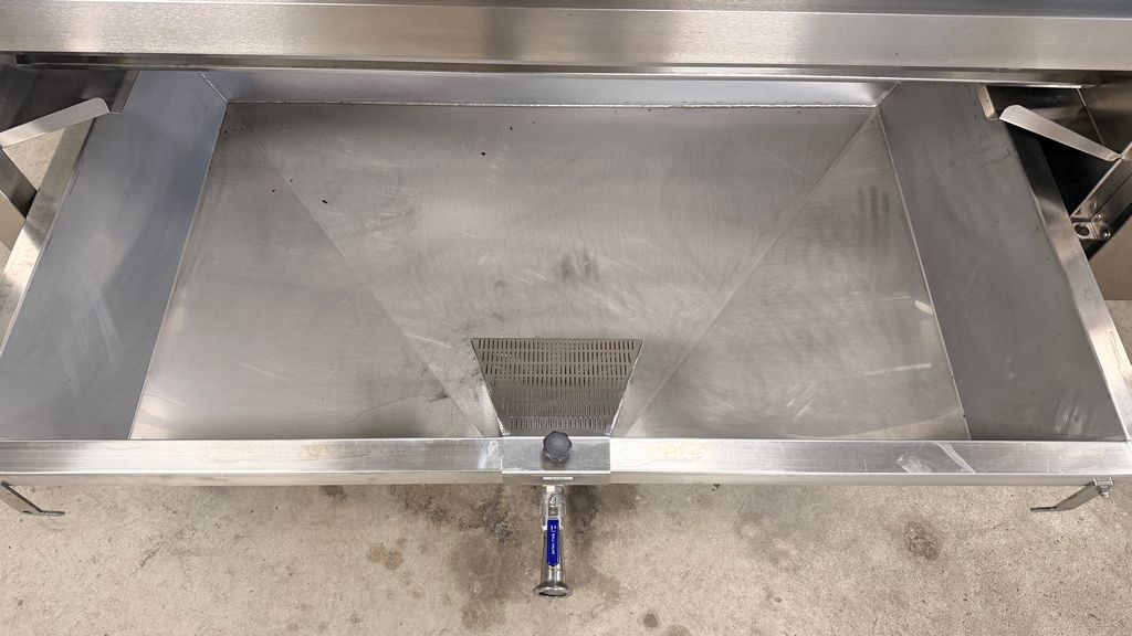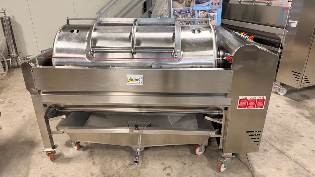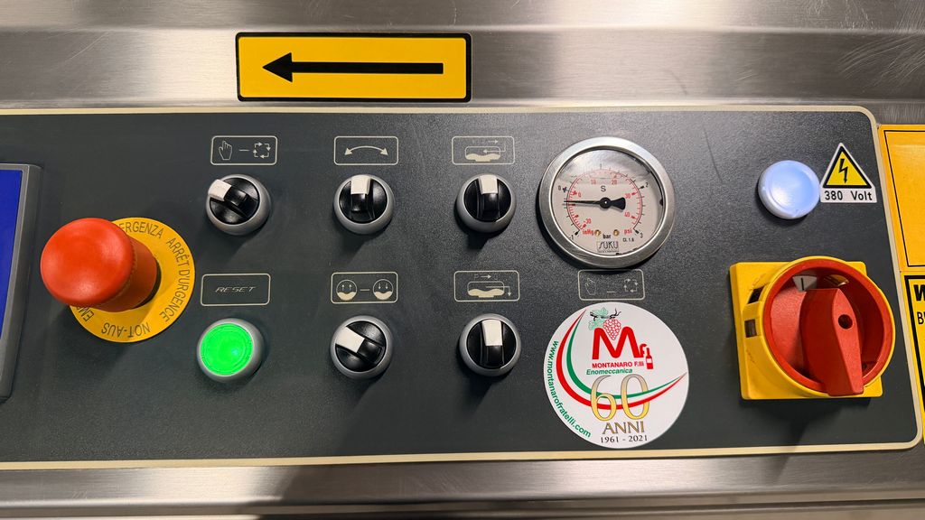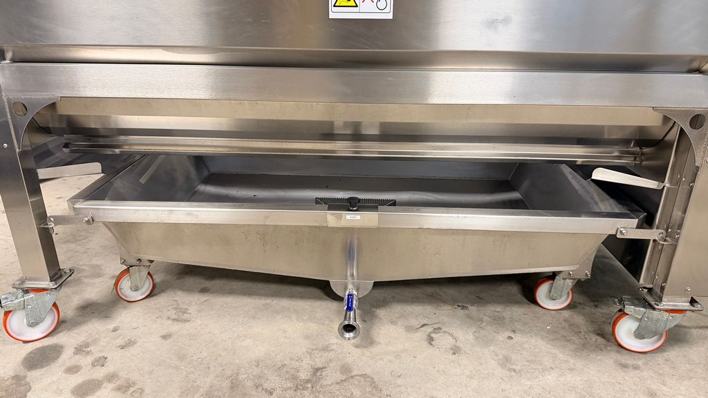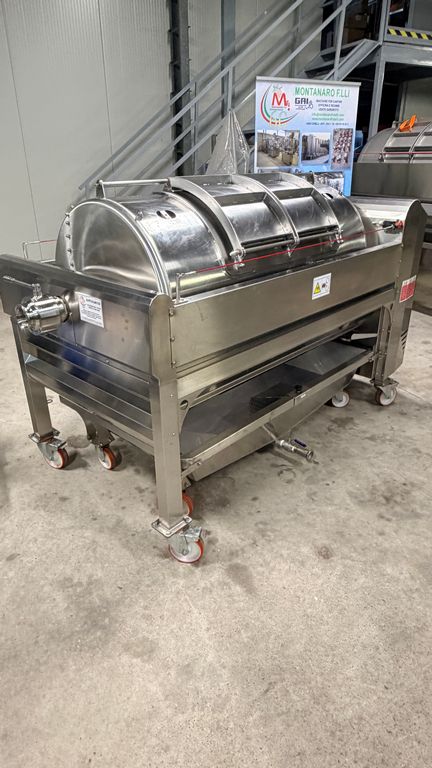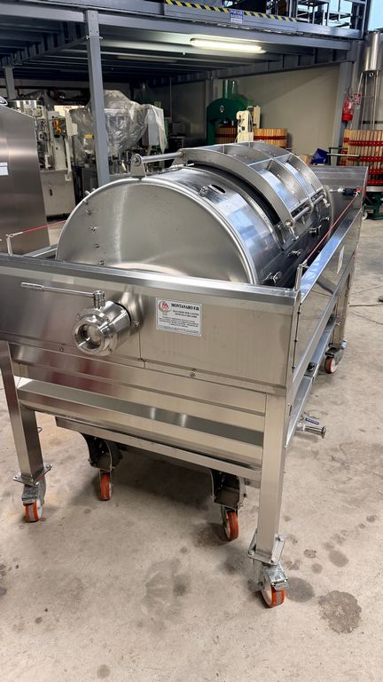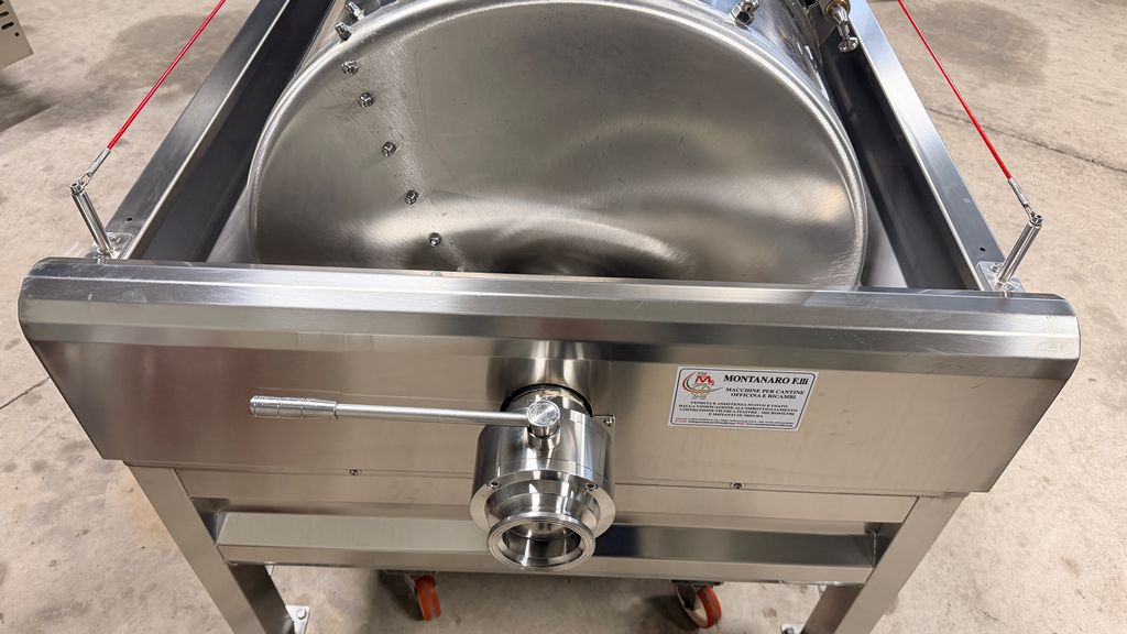 • ampia vaschetta inferiore raccogli mosto su ruote completa di prefiltro sullo scarico, completa di valvola sfera con attacco Garolla Ø40