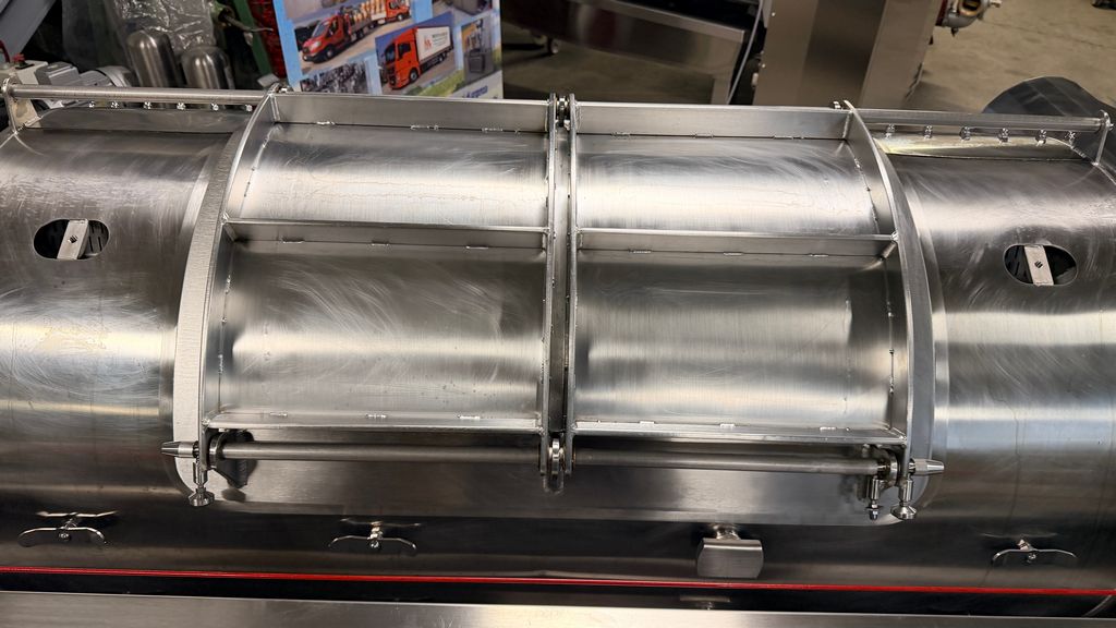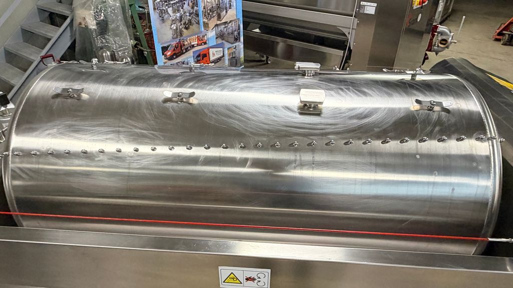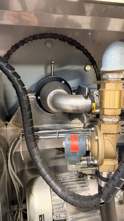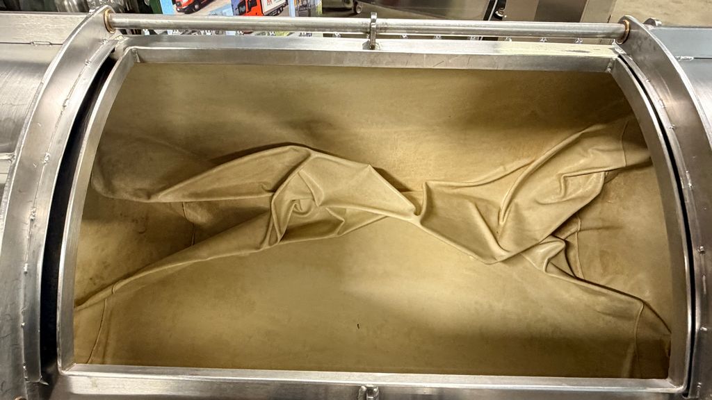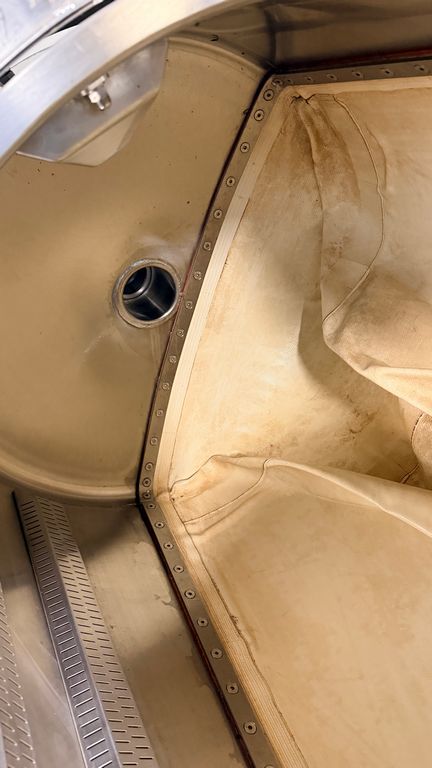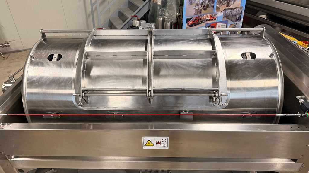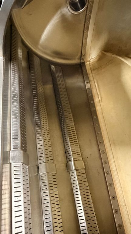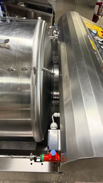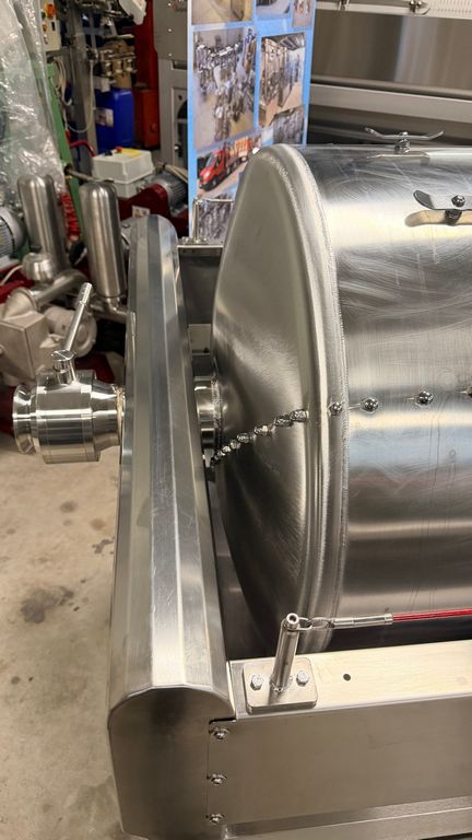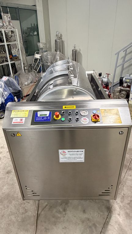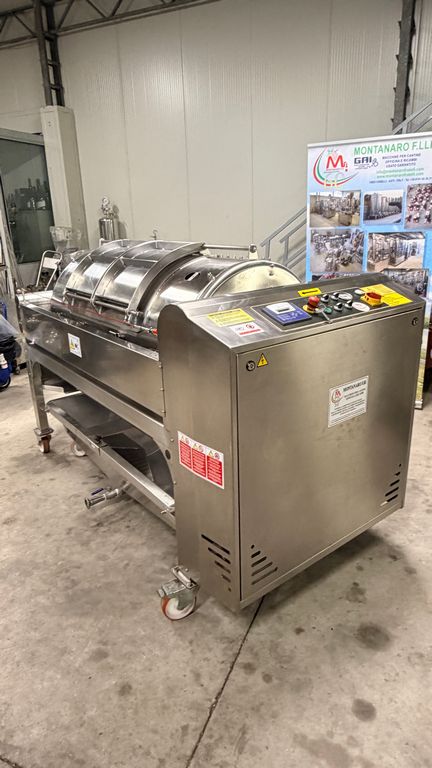 • ampia vaschetta inferiore raccogli mosto su ruote completa di prefiltro sullo scarico, completa di valvola sfera con attacco Garolla Ø40