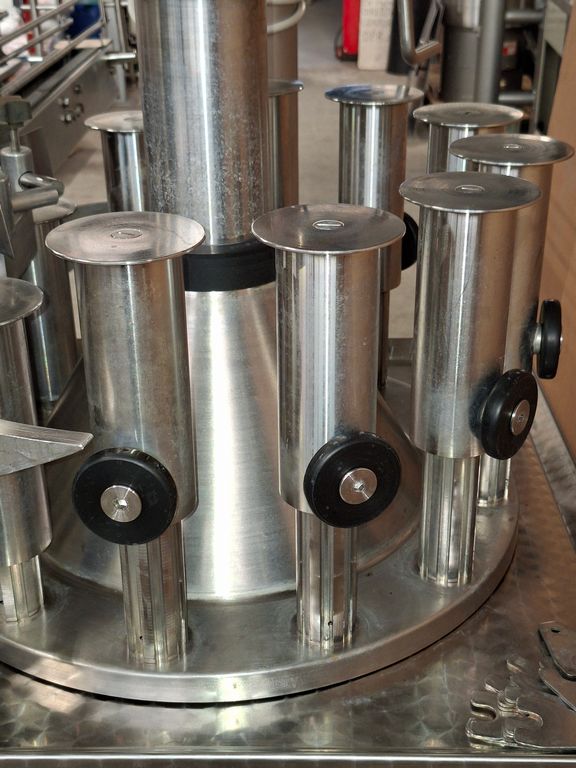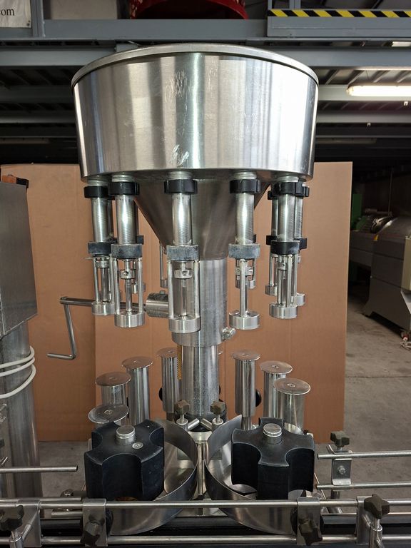 Riempitrice Gai in acciaio inox a 12 rubinetti, a gravità leggera depressione, con rubinetti di riempimento a canalino scorrevole. Pistoni alza bottiglie in acciaio inox meccanici a molla. Galleggiante per regolazione livello con comando valvola motorizzata per apertura/chiusura prodotto.