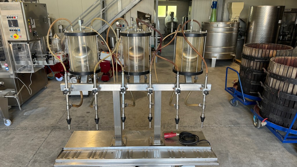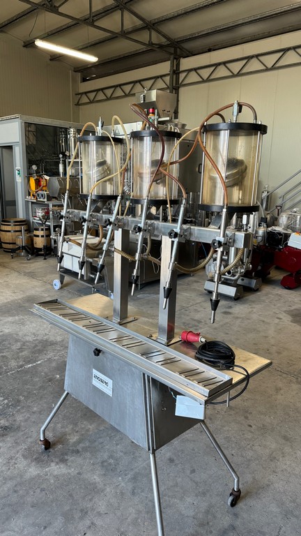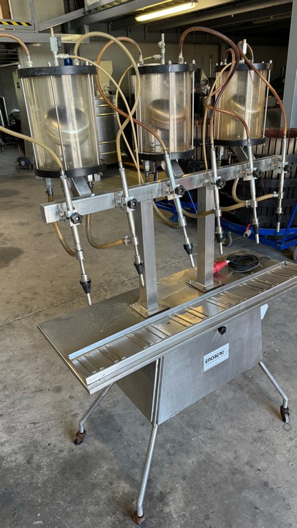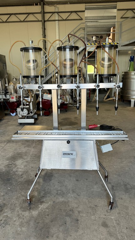 Riempitrice lineare a 6 becchi in acciaio inox a depressione, marca Enoberg.
